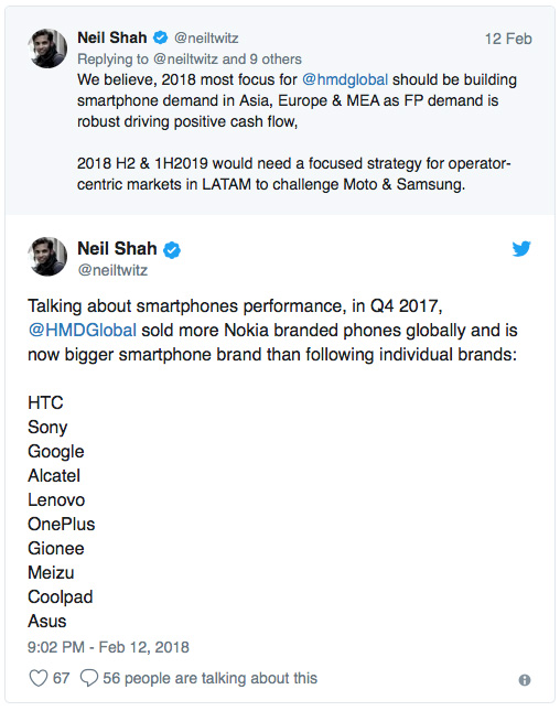 โดยผลสำรวจจาก Counterpoint บริษัทวิจัยชื่อดัง ในช่วงไตรมาสที่ 4 ปี 2017 ที่ผ่านมา Nokia สามารถทำยอดขายมือถือได้ทั้งหมด 4.4 ล้านเครื่อง ซึ่งทำผลงานได้ดีกว่าแบรนด์คู่แข่งหลายแบรนด์ด้วยกัน ไม่ว่าจะเป็น HTC, Sony, Google, Alcatel, Lenovo, OnePlus, Gionee, Meizu, Coolpad รวมถึง Asus อีกด้วย