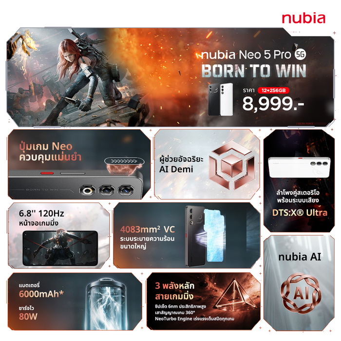 nubia เดินหน้ารุกตลาดเกมมิ่งสมาร์ตโฟนอย่างต่อเนื่อง เปิดตัว nubia Neo 5 Series ที่มาพร้อมคอนเซ็ปต์ “Born to Win” หรือ “เกิดมาเพื่อคว้าชัยชนะ” อย่างเป็นทางการในประเทศไทย มุ่งยกระดับประสบการณ์การเล่นเกมบนมือถือให้แก่คนรุ่นใหม่ ด้วยเทคโนโลยีระดับแฟลกชิปที่เข้าถึงได้ง่ายขึ้น นำทัพโดยรุ่นไฮไลต์อย่าง nubia Neo 5 GT 5G ที่ได้รับสืบทอด DNA ความแรงจาก REDMAGIC แบรนด์สมาร์ตโฟนเกมมิ่งระดับโลก
