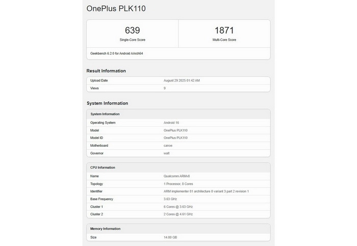 มือถือรหัส PLK110 ของ OnePlus ถูกพบในฐานข้อมูล Geekbench ล่าสุด โดยใช้ชิปใหม่ Qualcomm Snapdragon 8 Elite 2 คาดว่าจะเป็น OnePlus 15 ที่เตรียมเปิดตัวเร็ว ๆ นี้