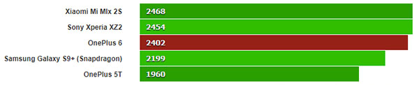 เมื่อลองนำคะแนน benchmark ของ OnePlus 6 ไปเทียบกับ benchmark ของสมาร์ทโฟนรุ่นอื่นๆ ที่ใช้ชิปเซ็ต Snapdragon 845 รวมไปถึง OnePlus 5T ซึ่งดูแล้วก็เป็นรองเพียง Xiaomi Mi Mix 2S เท่านั้น ตามกราฟด้านล่าง