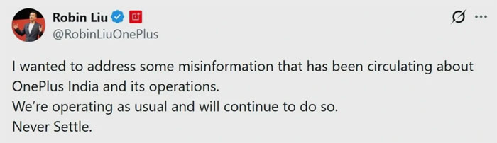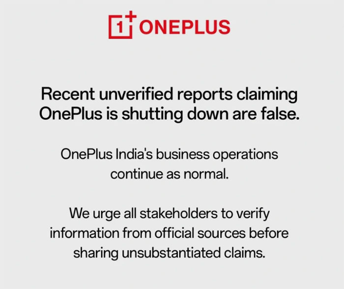 OnePlus ในอินเดียออกมาปฏิเสธอย่างหนักแน่นต่อรายงานที่อ้างว่าบริษัทกำลังปิดตัวหรือถูก “รื้อ/ยุบ” องค์กร โดย Robin Liu ซีอีโอของ OnePlus อินเดีย ได้ออกมาพูดถึงข่าวลือดังกล่าวเมื่อวันที่ 21 มกราคม ระบุว่าการดำเนินงานและกิจกรรมทางธุรกิจทั้งหมดในอินเดียยังคงเป็นปกติตามเดิม พร้อมย้ำว่าข้อกล่าวหาที่แพร่กระจายอยู่นั้นเป็นข้อมูลเท็จและทำให้เข้าใจผิด และขอให้ติดตามข้อมูลจากการสื่อสารอย่างเป็นทางการเท่านั้น