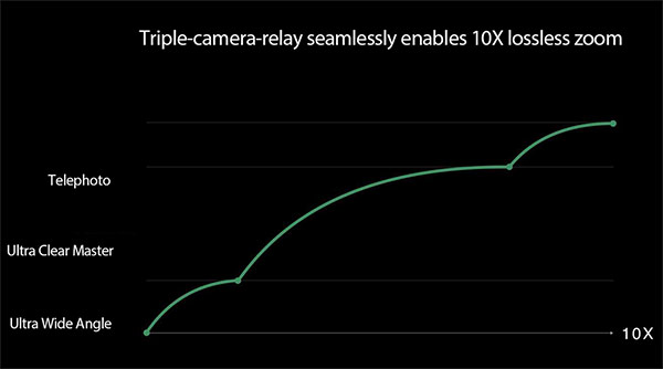 เทคโนโลยี 10x Lossless Zoom ก็คือเทคโนโลยีที่ช่วยให้กล้องถ่ายภาพบนสมาร์ทโฟน สามารถซูมได้ถึง 10 เท่า โดยที่ไม่สูญเสียรายละเอียด ซึ่งสิ่งที่อยู่เบื้องหลังคือกล้อง 3 ตัวที่ทำงานร่วมกัน ได้แก่กล้อง Ultra Wide Angle, กล้อง Ultra Clear Master และกล้อง Telephoto โดยในส่วนของกล้องมุมกว้างพิเศษอย่าง Ultra Wide Angle นั้นเทียบได้กับระยะโฟกัสที่ 15.9 มิลลิเมตร จึงสามารถเก็บรายละเอียดในภาพรวมแบบกว้างๆ ได้ดี ส่วนต่อมาคือกล้องตัวหลักอย่าง Ultra Clear Master ที่ทำหน้าที่ควบคุมคุณภาพของภาพถ่าย และส่วนสุดท้ายคือกล้อง Telephoto ที่มีทางยาวโฟกัสที่ 159 มิลลิเมตร ซึ่งเมื่อทำงานร่วมกับ Peep-Up Structure ที่ช่วยในเรื่องประสิทธิภาพของการซูมขยายภาพในระดับสูง ก็สามารถมั่นใจได้ว่าภาพที่ได้จะยังมีคุณภาพที่สูง แม้ต้องถ่ายด้วยการซูม หรือถ่ายจากระยะไกล