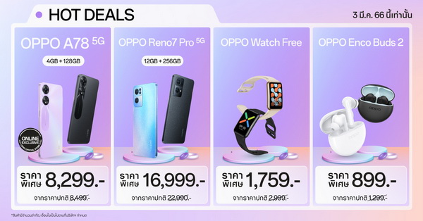 - OPPO A78 5G (4+128GB) สมาร์ตโฟน 5G พร้อมอัพสนุกให้สุดสปีด พิเศษทางช่องทาง Online Exclusive เพียง 8,299 บน Shopee จากราคาปกติ 8,499 บาท