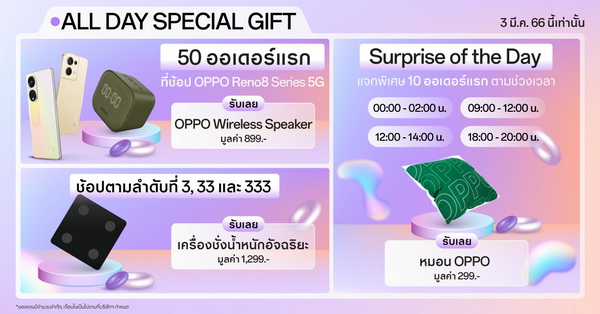 Surprise of the Day ของแถมแจกพิเศษตามช่วงเวลา เฉพาะที่ OPPO Official Store บน Shopee และ Lazada เท่านั้น