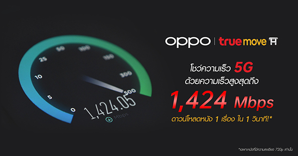 เร็วยิ่งกว่า! OPPO ประสบความสำเร็จในการทดลองการเชื่อมต่อ 5G ด้วยเครือข่ายทรูมูฟ เอช โชว์ความเร็วสูงสุดถึง 1,424 Mbps! ดาวน์โหลดหนัง 1 เรื่อง ในเวลาเพียง 1 วินาที เท่านั้น!