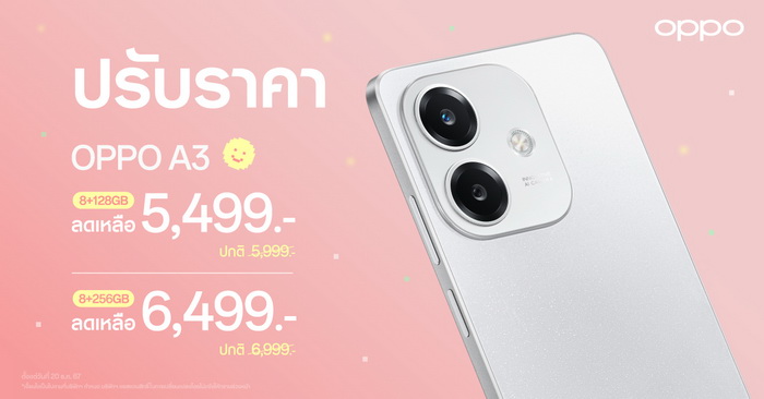 OPPO A3 สมาร์ตโฟนสวย เก่ง เกรด A จากตระกูล A ซีรีส์ สมาร์ตโฟนน้องเล็กที่ตอบโจทย์ทุกความต้องการของผู้ใช้งาน โดยเฉพาะสายบันเทิงและคนที่ชอบความทนทานพร้อมมอบประสบการณ์ใช้งานที่คุ้มค่ากว่า ในราคาที่คุ้มค่ายิ่งขึ้น สำหรับหน่วยความจำ RAM 8GB และ ROM 128GB มาในราคาใหม่สุดพิเศษ 5,499 บาท จากราคาปกติ 5,999 บาท และสำหรับหน่วยความจำ RAM 8GB และ ROM 256GB มาในราคาใหม่สุดคุ้มค่า 6,499 บาท จากราคาปกติ 6,999 บาท ตั้งแต่วันที่ 20 ธันวาคม 2567 เป็นต้นไป