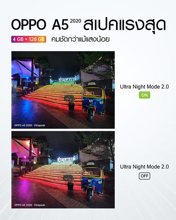 ล่าสุดนี้ทาง OPPO ประเทศไทย ได้เปิดตัว OPPO A5 2020 รุ่นอัปเกรดพร้อม RAM 4GB + ROM 128GB ในราคา 6,990 บาท และรองรับฟังก์ชัน Ultra Night Mode 2.0 สำหรับการถ่ายภาพในเวลากลางคืนโดยเฉพาะ