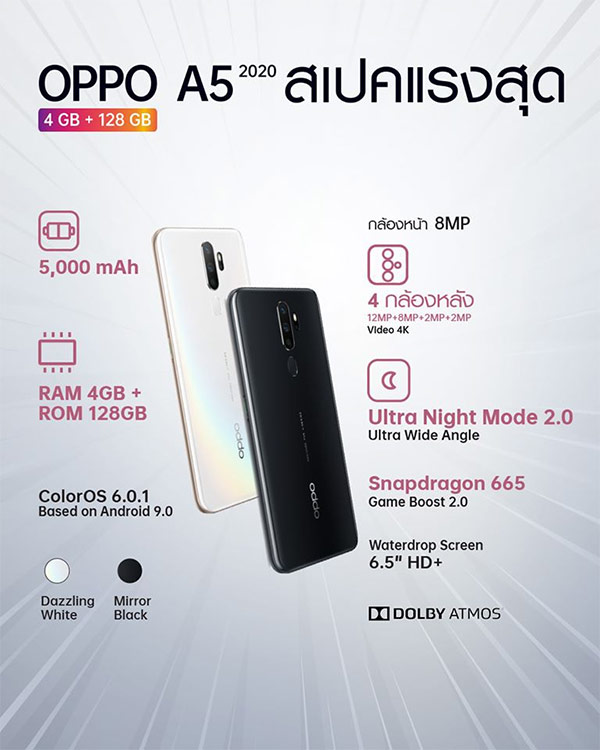 สรุปคุณสมบัติตัวเครื่องในเบื้องต้นของ OPPO A5 2020 4GB+128GB