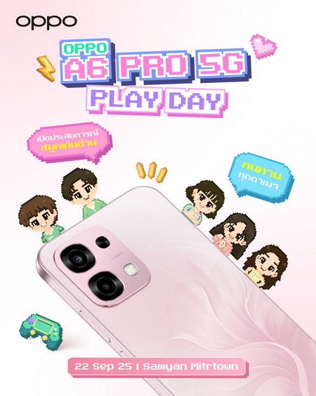 แฟนๆ OPPO เตรียมพบกับสมาร์ตโฟนรุ่นใหม่ล่าสุด OPPO A6 Pro 5G สมูทเกินต้าน ทนทานทุกดาเมจ ที่มาพร้อมการอัปเกรดเกินต้าน มอบประสบการณ์การใช้งานลื่นไหล ทนทาน และดีไซน์ที่โดดเด่น พร้อมใกล้ชิดกับศิลปินเกิร์ล กรุ๊ปสุดป๊อบจากวง ‘PiXXiE’ ประกอบไปด้วย ‘มาเบล สุชาดา, พิมมา พิมพ์มาดา และ อิงโกะ อินท์ปาลี’ และติดขอบเวทีไปกับคู่นักแสดงสุดฮอต ‘โทมัส ธีร์ทัศน์ - ก้อง ก้องภพ’ ที่จะมาร่วมทดสอบประสิทธิภาพสุดเกินต้านนี้ ได้ที่งาน “OPPO A6 Pro 5G Play Day เปิดประสบการณ์สมูทเกินต้าน ทนทานทุกดาเมจ” พร้อมกันแบบจัดเต็มได้ที่ชั้น G สามย่านมิตรทาวน์ ในวันที่ 22 กันยายนนี้