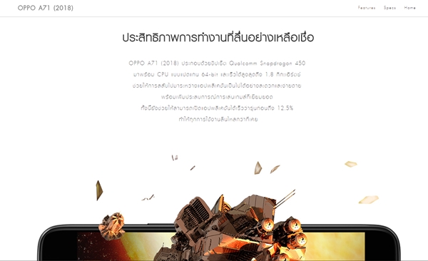 สำหรับ OPPO A71 (2018) ยังคงถอดแบบการดีไซน์ตัวเครื่องขอบมนแบบ Unibody คล้ายกับรุ่นก่อน แต่ได้ปรับปรุงคุณสมบัติบางส่วน ด้วยการหันไปใช้งานขุมพลังจากค่าย Qualcomm อย่าง Snapdragon 450 ความรเ็วในการประมวลผล 1.8GHz ซึ่งจะช่วยให้ตัวเครื่องมีความเร็วจากรุ่นก่อนราว 12.5% นอกจากนี้ ยังมาพร้อมกับจุดเด่นด้านการติดตั้งระบบ A.I. Beauty Recogition Technology มาให้ด้วย ซึ่งจะเป็นการใช้ปัญญาประดิษฐ์ (AI) มาวิเคราะห์ลักษณะใบหน้าผู้ใช้งานแต่ละบุคคล เพื่อนำไปปรับแต่งให้ภาพเซลฟี่มีความสวยงามเป็นธรรมชาติ ซึ่งเป็นฟีเจอร์เดียวกันกับ OPPO F5 Series นั่นเอง โดย OPPO A71 (2018) มาพร้อมกับคุณสมบัติดังต่อไปนี้