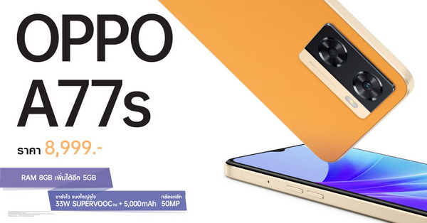ออปโป้ ไทยแลนด์ วางจำหน่ายสมาร์ตโฟน 2 รุ่นใหม่ “OPPO A77s” และ “OPPO A17” สมาร์ตโฟนรุ่นล่าสุดจาก OPPO A Series อย่างเป็นทางการในประเทศไทย พร้อมชูสโลแกน “เต็มอิ่มความสนุก ทุกเอ็นเทอร์เทนเมนต์” และ “คุ้มค่ากว่าราคาโดนใจ” โดย OPPO A77s มาพร้อม RAM 4GB + ROM 64GB พร้อมเพิ่ม RAM ได้มากถึง 5GB นอกจากนี้ยังมาพร้อมแบตเตอรี่ขนาดใหญ่ 5,000mAh เสริมด้วย ชาร์จไว 33W SUPERVOOC มอบอายุการใช้งานที่ยาวนานยิ่งขึ้น