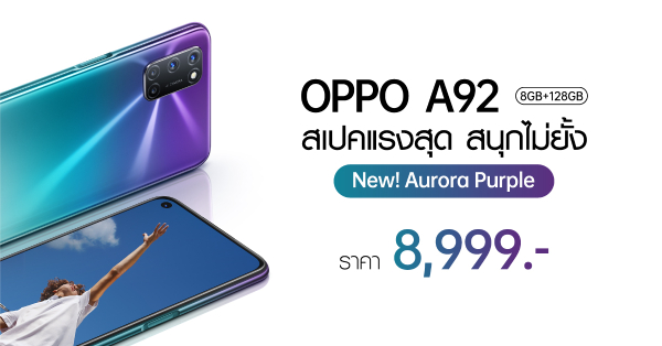 โดย OPPO A92 สี Aurora Purple (สีม่วง) มาในราคา 8,999 บาท ที่ OPPO Brand Shop ทุกสาขา และตัวแทนจำหน่ายทั่วประเทศ