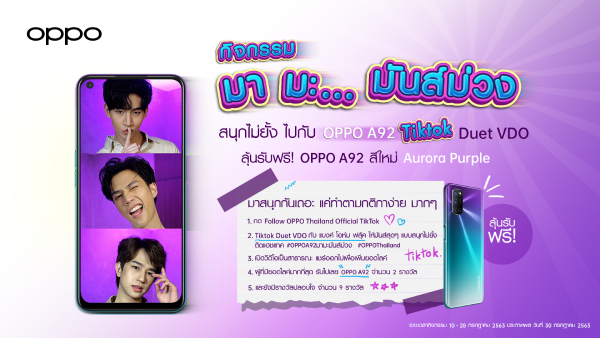และสีใหม่ยังมาพร้อมกับกิจกรรมใหม่แบบสนุกไม่ยั้ง กับกิจกรรมมา มะ... มันส์ม่วง สนุกไม่ยั้ง กับ OPPO A92 ด้วยการ Duet VDO ผ่าน Tiktok OPPO Thailand Official พร้อมลุ้นรับฟรี! OPPO A92 สีใหม่ Aurora Purple (สีม่วง) และ เซอร์ไพรส์จาก แบงค์ ธิติ และ โอห์ม ฟลุ้ค ที่แฟนๆ ห้ามพลาด! ใครที่สนใจร่วมกิจกรรมคลิกได้ที่ https://vt.tiktok.com/UavFur/
