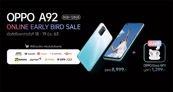 OPPO A92 เปิดราคาทางการที่ 8,999 บาท กับตัวเลือก 2 สี ได้แก่ Twilight Black และ Shining White โดยผู้ที่สั่งซื้อ OPPO A92 แบบ Online Early Bird Sale ในระหว่างวันที่ 18 - 19 มิถุนายนนี้จะได้รับฟรี OPPO Enco W11 หูฟังไร้สายรุ่นใหม่ล่าสุดมูลค่า 1,299 บาท