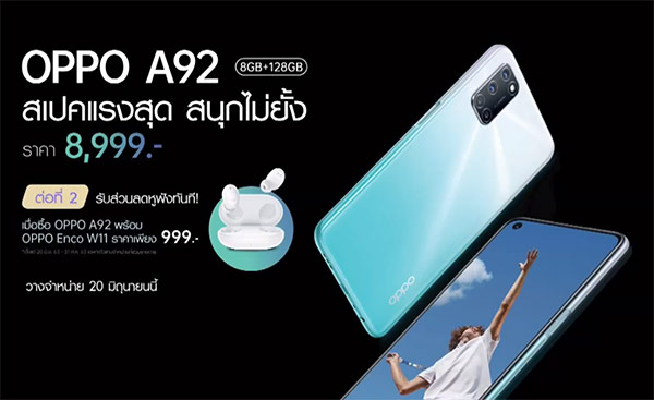 OPPO A92 จะเริ่มวางจำหน่ายอย่างเป็นทางการในวันที่ 20 มิถุนายนนี้ พร้อมรับของแถม 2 ต่อ โดยต่อแรก รับฟรี AIR Purifier Gift Box มูลค่า 500 บาท และต่อที่ 2 รับสิทธิ์สั่งซื้อหูฟังไร้สาย OPPO Enco W11 ในราคาเพียง 999 บาท