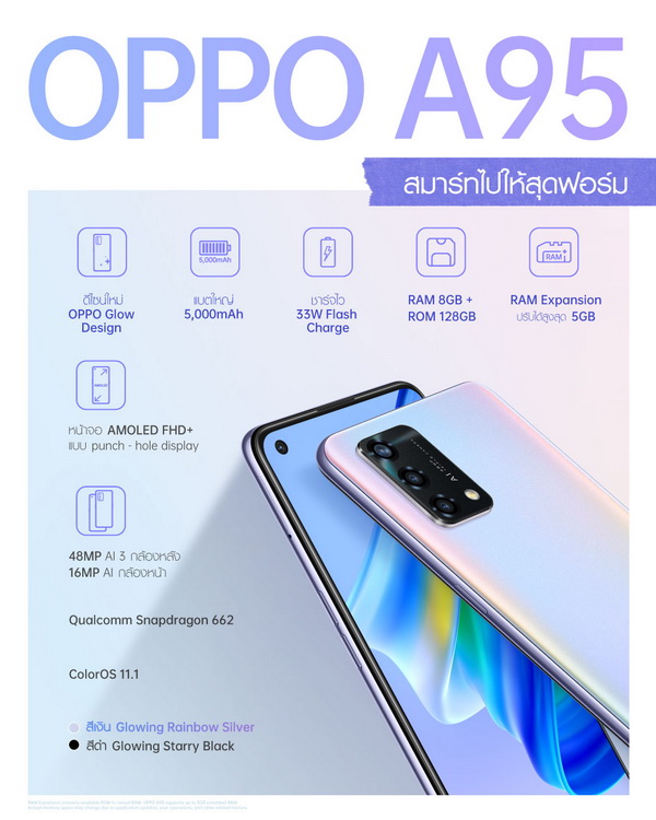 OPPO A95 สมาร์ทโฟนใหม่ล่าสุดจาก OPPO A Series มาภายใต้สโลแกน “สมาร์ทไปให้สุดฟอร์ม” ที่โดดเด่นด้วยประสิทธิภาพการใช้งานที่ลื่นไหลด้วย RAM 8GB, ROM 128GB และ RAM Expansion ที่สามารถเพิ่มได้ถึง 5GB พร้อมด้วย Qualcomm® SnapdragonTM 662 และ System Booster มอบความเร็วแรงขั้นสุดให้คุณสนุกได้ทุกการใช้งาน นอกจากการใช้งานที่เร็วแรงแล้ว ยังมาพร้อมชาร์จไว 33W Flash Charge และแบตเตอรี่ขนาดใหญ่จุใจ 5,000 mAh ให้คุณสนุกได้แบบไม่มีสะดุด รวมถึง AI 3 กล้องหลัง ความละเอียดสูงสุด 48MP ให้คุณทั้งถ่ายภาพและวิดีโอสนุกทุกช็อต พร้อมรองรับ Steady Video ในกล้องหลัง ให้คุณสามารถถ่ายวิดีโอได้นิ่งในทุกสถานการณ์