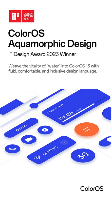 Aquamorphic Design เป็นแนวคิดการออกแบบใหม่สำหรับ ColorOS ที่ได้รับการยอมรับอย่างกว้างขวางจากรางวัลในปีนี้ ด้วยแรงบันดาลใจจากสายน้ำ Aquamorphic Design มีเป้าหมายเพื่อมอบประสบการณ์การใช้งานที่น่าพึงพอใจและน่าดื่มด่ำซึ่งมีทั้งความสงบและความทรงพลัง การออกแบบนี้ได้เเลือกชุดสีรูปแบบระบบใหม่ แบบอักษร และรูปแบบการ์ดที่มีพื้นผิวแบบโพลีมอร์ฟิคที่ช่วยพัฒนาความสัมพันธ์ระหว่างมนุษย์และเทคโนโลยีผ่านการโต้ตอบที่สะดวกสบาย ยืดหยุ่น และครอบคลุมมากขึ้น