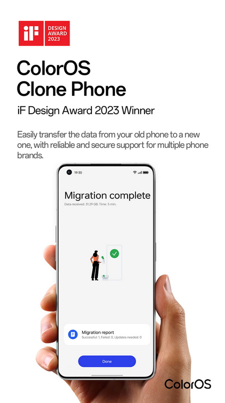 ผู้ชนะรางวัล 2023 iF Design Award ในหมวดแอปฯ Clone Phone เป็นแอปฯ ที่ปลอดภัยซึ่งช่วยลดความยุ่งยากในการย้ายข้อมูลจากโทรศัพท์เครื่องเก่าไปยังโทรศัพท์เครื่องใหม่โดยไม่ต้องใช้สายเคเบิลหรืออุปกรณ์อื่นๆ ช่วยพัฒนาประสบการณ์ใช้งานการย้ายข้อมูลในขณะที่ยังช่วยปกป้องข้อมูลผู้ใช้ผ่านการรักษาความปลอดภัยเพิ่มเติม