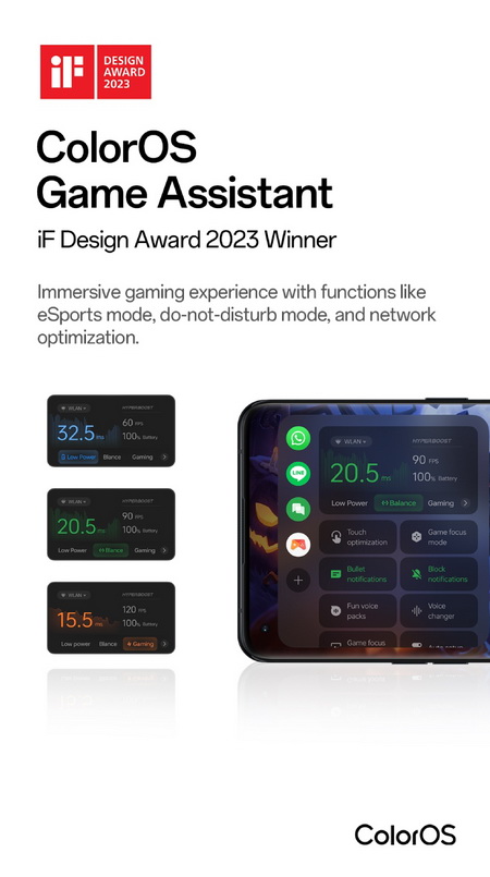 iF Design Awards เป็นหนึ่งในรางวัลการออกแบบอันทรงเกียรติที่สุดในโลก นอกเหนือจากการชนะ 6 รางวัลใน ColorOS 13 แล้ว OPPO ยังได้รับรางวัลสำหรับสมาร์ตโฟน OPPO Find N2 Flip เพื่อเป็นการยกย่องความสำเร็จของ OPPO ในการออกแบบฟอร์มแฟกเตอร์ที่ใหม่และน่าตื่นเต้น