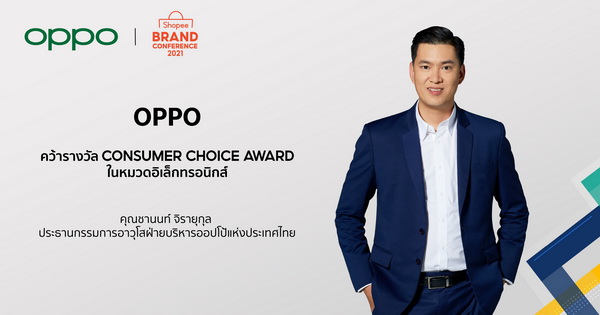 ออปโป้ นำโดย คุณชานนท์ จิรายุกุล ประธานกรรมการอาวุโสฝ่ายบริหาร ออปโป้แห่งประเทศไทย เป็นตัวแทนรับรางวัล Consumer Choice Award ในงาน Shopee Brand Conference 2021 ที่จัดขึ้นแบบ Virtual ผ่านระบบไลฟ์สตรีมมิ่ง ในวันที่ 5 สิงหาคมที่ผ่านมา โดยรางวัลดังกล่าวได้สะท้อนให้เห็นถึงความเป็นที่นิยมของแบรนด์ออปโป้ในหมู่นักช้อปออนไลน์ชาวไทย ทั้งยังตอกย้ำความเป็นผู้นำอันดับหนึ่งของแบรนด์สมาร์ทโฟนในไทย ที่มีความมุ่งมั่นในการส่งมอบนวัตกรรมและเทคโนโลยีสุดล้ำที่ตอบสนองไลฟ์สไตล์และความต้องการของผู้บริโภคได้อย่างตรงจุด และสามารถมอบประสบการณ์การช้อปปิ้งออนไลน์ที่ดีที่สุด ผ่านผลิตภัณฑ์ที่หลากหลาย และโปรโมชันที่โดนใจ จนได้รับการไว้วางใจให้เป็นแบรนด์สมาร์ทโฟนที่ได้รับเสียงตอบรับที่ดีจากลูกค้าชาวไทยได้อย่างต่อเนื่อง