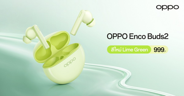 9 สิงหาคม 2566 กรุงเทพฯ - ออปโป้ วางจำหน่าย “OPPO Enco Buds2” สีใหม่! สีเขียว Lime Green หูฟังไร้สายตัวเล็ก เบสทรงพลัง ส่งมอบประสบการณ์เสียงระดับคุณภาพ คมชัด สมจริง ให้คุณเพลิดเพลินไปกับทุกจังหวะในชีวิต มาพร้อมดีไซน์ขนาดเล็ก หยิบใช้งานง่าย ใส่สบายตลอดวัน ใช้งานได้ยาวนาน ชาร์จเร็ว และเชื่อมต่อได้เสถียร ในราคา 999 บาท เท่านั้น