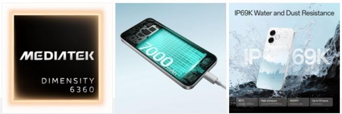 มือถือทั้งสองรุ่นมาพร้อมชิปเซ็ต MediaTek Dimensity 6360 Max, แบตเตอรี่ความจุ 7,000mAh และมาตรฐานป้องกันน้ำและฝุ่นระดับ IP69K