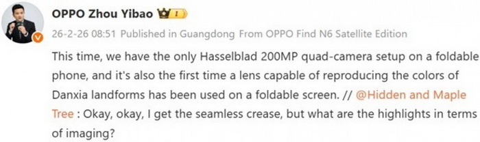 พนักงานรายดังกล่าวยังระบุด้วยว่า OPPO Find N6 จะเป็นสมาร์ตโฟนจอพับ “เพียงรุ่นเดียว” ที่มาพร้อมชุดกล้องหลัง 4 ตัว ความละเอียด 200MP ที่ผ่านการปรับจูนโดย Hasselblad
