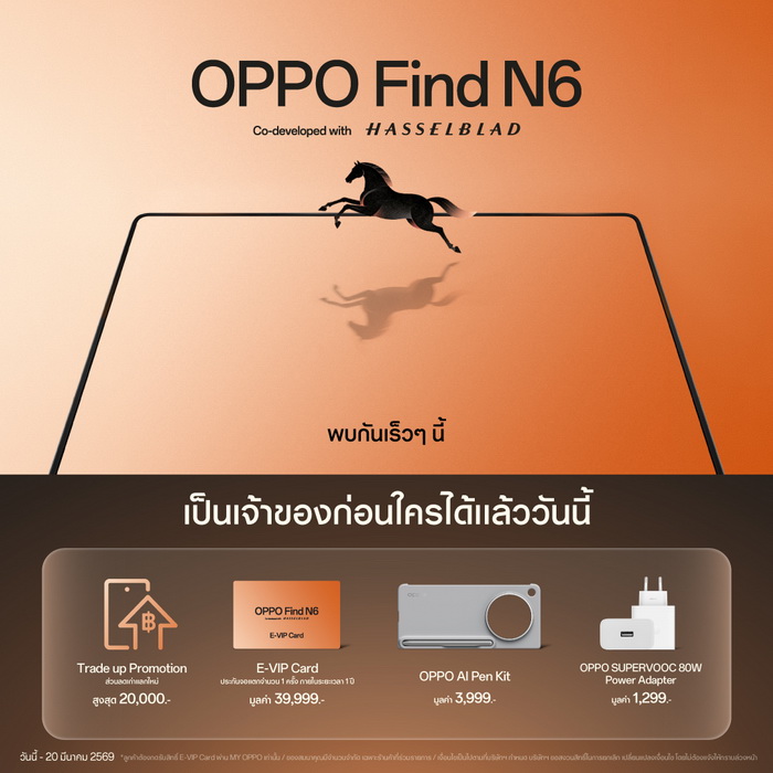 และพิเศษสำหรับลูกค้าที่สั่งจอง OPPO Find N6 ล่วงหน้า ระหว่างวันที่ 12 - 20 มีนาคม 2569 จะได้รับของสมนาคุณรวมมูลค่า 45,297 บาท ประกอบด้วย