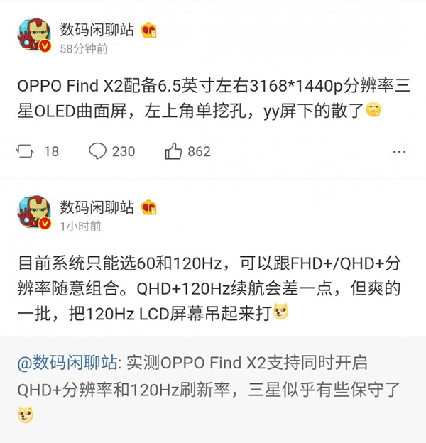 ข้อมูลชุดนี้มีแหล่งข่าวมาจากเว็บไซต์ Weibo ของจีน ซึ่งระบุว่า OPPO Find X2 อาจจะมีหน้าจอ OLED ขอบโค้ง ไร้ขอบหมดจดขนาด 6.5 นิ้ว ความละเอียด 3168x1440 พิกเซล (QHD+) พร้อมทั้งฟีเจอร์ยอดฮิตประจำปี 2020 อย่างอัตรารีเฟรช 120Hz แต่ที่น่าสนใจคือ OPPO Find X2 อาจจะเปิดใช้หน้าจอ 120Hz ที่ความละเอียด QHD+ ได้ด้วย ในขณะที่คู่แข่งอย่าง Samsung Galaxy S20 Series คาดกันว่าจะเปิดจอ 120Hz ได้ที่ความละเอียด FHD+ เท่านั้น