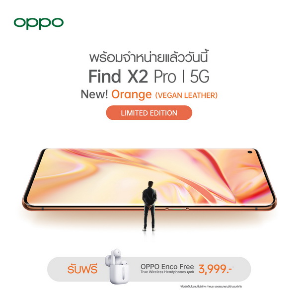 โดยสามารถเป็นเจ้าของ OPPO Find X2 Pro 5G Orange (Vegan Leather) Limited Edition ในราคาจำหน่าย 40,990 บาท ได้แล้ววันนี้ ณ OPPO Brand Shop ทุกสาขา, ร้านค้าออนไลน์ OPPO Official Store และตัวแทนจำหน่ายทั่วประเทศ พร้อมรับฟรี OPPO Enco Free True Wireless Headphones มูลค่า 3,999 บาท