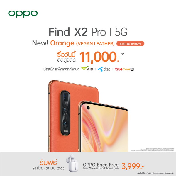 หรือ สามารถซื้อผ่านผู้ให้บริการเครือข่ายทั่วประเทศ ลดสูงสุด 11,000 บาท วันนี้ – 30 เมษายน 2563 พิเศษสำหรับ OPPO Find X2 Pro 5G ทั้งสี Orange (Vegan Leather) Limited Edition และ สี Black (Ceramic) รับฟรี OPPO Enco Free True Wireless Headphones มูลค่า 3,999 บาท