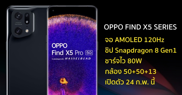 OPPO Find X5 Series เผยสเปกครบ 3 รุ่น จัดเต็มชิป Snapdragon 8 Gen1, ชาร์จไว 80W และจอ AMOLED 120Hz เตรียมเปิดตัว 24 ก.พ. นี้