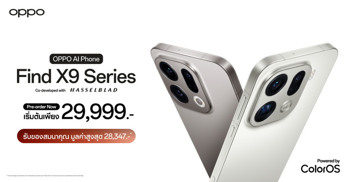 ออปโป้ ประเทศไทย เปิดตัวสมาร์ตโฟนแฟลกชิปรุ่นใหม่ล่าสุด “OPPO Find X9 Series” สมาร์ตโฟน “ซูมดีทุกคอนเสิร์ต” ที่ครบเครื่องทั้งภาพนิ่งและวิดีโอระดับโปรในเครื่องเดียว ด้วยเทคโนโลยีกล้อง Hasselblad Telephoto ความละเอียดสูงสุด 200MP พร้อมพลังซูมไกล 120x Super Zoom และโหมด Stage Mode เก็บครบทุกอารมณ์และจังหวะของศิลปินด้วยวิดีโอคมชัดระดับ 4K 120fps สานต่อความร่วมมือกับ Hasselblad ยกระดับพอร์ตเทรตให้สีผิวธรรมชาติ มีมิติ แสง และโทนสีสมจริงในทุกช็อตผ่านโหมด Hasselblad Portrait ทำงานลื่นไหลยิ่งกว่าเคยด้วยระบบปฏิบัติการ ColorOS 16 ใหม่ล่าสุด บนดีไซน์ใหม่สะท้อนความพรีเมียมทุกองศา ขอบหน้าจอบางเฉียบ จับถนัดมือ เปิดตัวพร้อมกัน 2 รุ่น ได้แก่ OPPO Find X9 Pro ในราคา 42,999 บาท และ OPPO Find X9 ในราคาเริ่มต้น 29,999 บาท พร้อมหูฟังไร้สายระดับแฟลกชิป OPPO Enco X3s ในราคา 4,999 บาท สัมผัสได้แล้ววันนี้ ณ OPPO Brand Shop ทุกสาขา และตัวแทนจำหน่ายทั่วประเทศ
