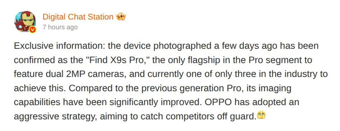 อย่างไรก็ตาม ข่าวลือล่าสุดจากจีนระบุว่าอุปกรณ์ดังกล่าวไม่ได้ใช้ชื่อ Find X9s แต่ชื่อจริงคือ OPPO Find X9s Pro โดยทิปสเตอร์ Digital Chat Station (DCS) โพสต์บน Weibo ยืนยันว่าชื่อของรุ่นนี้คือ OPPO Find X9s Pro และ DCS ยังระบุว่า นี่คือเรือธงเพียงรุ่นเดียวที่ใช้ชื่อ “Pro” แต่ได้กล้อง 200MP ถึง 2 ตัว ขณะที่อีกแหล่งข่าวบน Weibo อย่าง WhyLab ก็สนับสนุนข้อมูลทั้งเรื่องชื่อรุ่นและสเปกกล้องเช่นกัน
