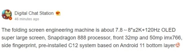 Digital Chat Station แหล่งข่าวจากประเทศจีนรายหนึ่งได้ออกมาเปิดเผยสเปกของมือถือจอพับจาก OPPO ให้ได้ทราบกัน โดยมาพร้อมกับหน้าจอแสดงผลแบบ AMOLED ความละเอียดระดับ 2K (1200x2000 พิกเซล) ขนาด 7.8 นิ้ว - 8.0 นิ้ว ที่มีค่า Refresh Rate ระดับ 120Hz เพื่อช่วยให้แสดงผลได้อย่างลื่นไหล ภายในขับเคลื่อนด้วยชิปเซ็ตตัวท็อประดับ 5 นาโนเมตรอย่าง Snapdragon 888