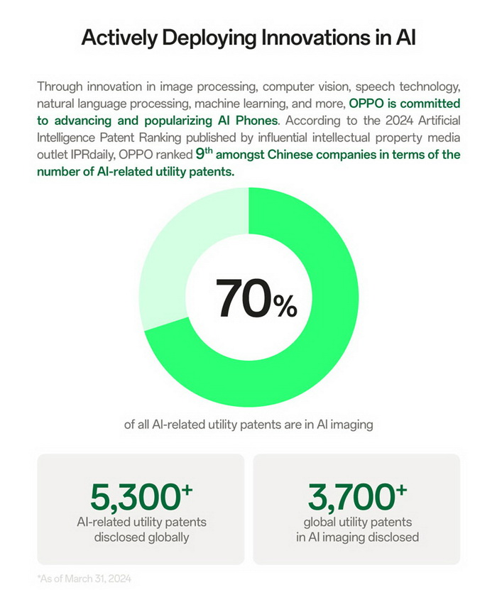 ด้วยการลงทุนด้านการวิจัยและพัฒนาอย่างกว้างขวางในด้านต่าง ๆ เช่น การประมวลผลภาพ คอมพิวเตอร์วิทัศน์ เทคโนโลยีคำพูด การประมวลผลภาษาธรรมชาติ และการเรียนรู้ของเครื่อง OPPO กำลังบุกเบิกการพัฒนาเทคโนโลยี AI และการใช้งานที่แพร่หลายในผลิตภัณฑ์สมาร์ตโฟนของตน ณ วันที่ 31 มีนาคม 2024 OPPO ได้ยื่นจดสิทธิบัตรที่เกี่ยวข้องกับ AI จำนวน 5,399 ฉบับทั่วโลก รวมถึงสิทธิบัตรด้านอรรถประโยชน์ 3,796 ฉบับในการสร้างภาพ AI จาก “Artificial Intelligence Patent Ranking” ที่เผยแพร่โดยสื่อทรัพย์สินทางปัญญา IPRdaily เมื่อวันที่ 22 เมษายน 2024 OPPO อยู่ในอันดับที่ 9 ในประเทศจีน โดยได้รับสิทธิบัตรการประดิษฐ์ที่เกี่ยวข้องกับ AI ทั้งหมด 3,743 ฉบับ