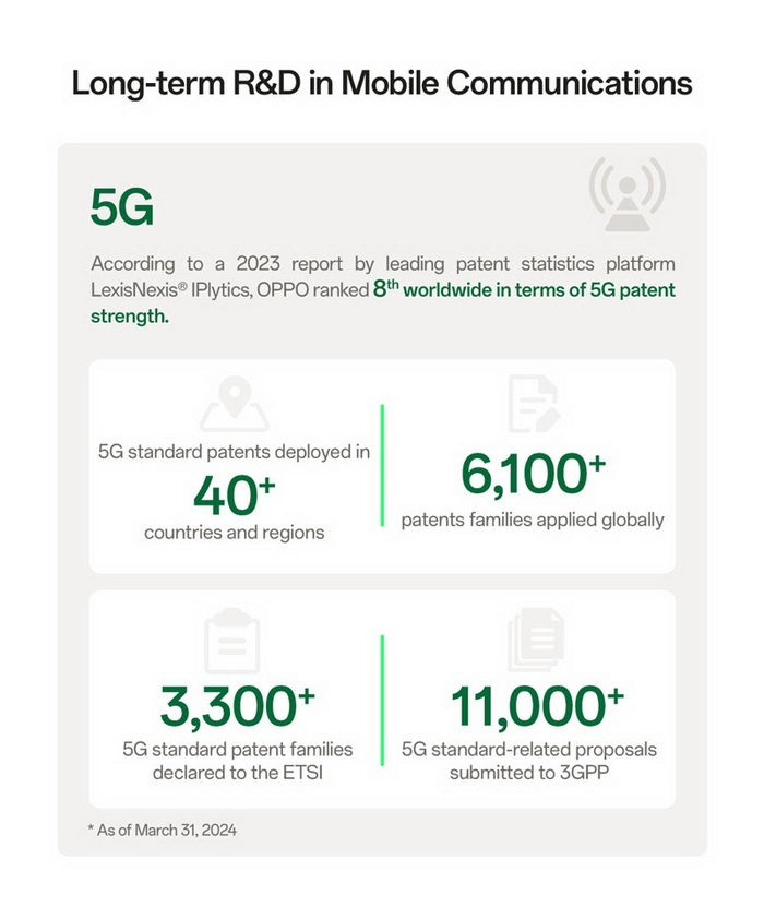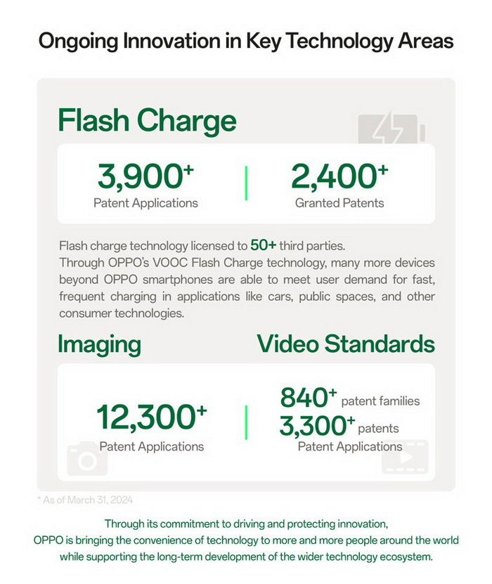 จนถึงปัจจุบัน OPPO ได้ปรับใช้สิทธิบัตรมาตรฐาน 5G ที่จำเป็นในกว่า 40 ประเทศและภูมิภาคทั่วโลก นอกจากนี้ บริษัทยังได้ยื่นคำขอรับสิทธิบัตรทั่วโลกมากกว่า 6,100 ตระกูล ประกาศสิทธิบัตรมาตรฐาน 5G มากกว่า 3,300 ตระกูลต่อสถาบันมาตรฐานโทรคมนาคมแห่งยุโรป (ETSI) และส่งข้อเสนอที่เกี่ยวข้องกับมาตรฐาน 5G มากกว่า 11,000 ฉบับไปยังโครงการความร่วมมือรุ่นที่ 3 (3GPP) ในด้านอื่นๆ OPPO ได้ยื่นขอสิทธิบัตรที่เกี่ยวข้องกับการถ่ายภาพทั่วโลกมากกว่า 12,306 ฉบับ และได้อนุญาตเทคโนโลยีการชาร์จไว VOOC ให้กับบริษัทมากกว่า 50 แห่ง ทำให้มีอุปกรณ์อิเล็กทรอนิกส์ที่มีความสามารถในการชาร์จที่รวดเร็วมากขึ้น
