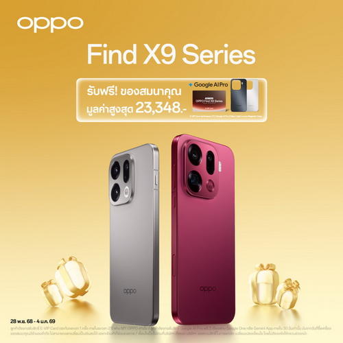 สัมผัสประสบการณ์ซูมดีทุกคอนเสิร์ตด้วยกล้อง 200MP Hasselblad Telephoto จาก OPPO Find X9 Pro มอบภาพถ่ายคมชัดทุกรายละเอียด แม้ครอปภาพก็ยังคงความคมชัดเหนือระดับ และในรุ่น OPPO Find X9 Pro และ OPPO Find X9 มาพร้อมพลังซูมไกล 120x Super Zoom และการบันทึกวิดีโอความละเอียดสูงระดับ 4K 120fps มาพร้อม Stage Mode ที่รองรับทั้งการถ่ายภาพและวิดีโอให้เก็บทุกอารมณ์และจังหวะของศิลปินได้อย่างสมบูรณ์แบบ มาพร้อมสีใหม่ “Velvet Red” สีแดงสุดพรีเมียม โดยเมื่อซื้อ OPPO Find X9 Pro และ OPPO Find X9 รับฟรี E-VIP Card ประกันจอแตก 1 ครั้ง ภายในระยะเวลา 2 ปี, ฟรี Google AI Pro 3 เดือน, Light Luxury Magnetic Case มูลค่ารวม 23,348 บาท และมูลค่ารวม 19,348 บาท ตามลำดับ