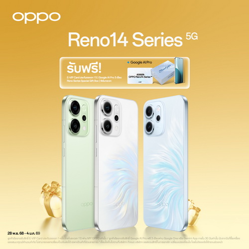 OPPO Reno14 Series 5G สมาร์ตโฟน The AI Portrait Expert ถ่ายพอร์ตเทรตสวยทุกโมเมนต์ มาพร้อมกล้องพอร์ตเทรตซูมได้ 3.5 เท่า อีกทั้งยังมาพร้อม AI Flash Photography ที่ช่วยให้การถ่ายภาพพอร์ตเทรตในสภาพแสงน้อยมีคุณภาพสูงขึ้นอย่างเห็นได้ชัด มอบรายละเอียดผิวชัดเจน สีผิวมีความนุ่มนวลคงความเป็นธรรมชาติ และยังให้อารมณ์ของภาพสุดชิคแบบ Y2K เทรนด์สุดฮิตของเหล่าวัยรุ่น โดยเมื่อซื้อ OPPO Reno14 Pro 5G รับฟรี E-VIP Card ประกันจอแตก 1 ครั้ง ภายในระยะเวลา 1 ปี, ฟรี Google AI Pro 3 เดือน, Reno Series Special Gift Box, ฟิล์มกระจก มูลค่ารวม 14,148 บาท และ เมื่อซื้อ OPPO Reno14 5G รับฟรี E-VIP Card ประกันจอแตก 1 ครั้ง ภายในระยะเวลา 1 ปี, ฟรี Google AI Pro 3 เดือน, Reno Series Special Gift Box, ฟิล์มกระจก มูลค่ารวม 11,148 บาท และเมื่อซื้อ OPPO Reno14 F 5G รับฟรี E-VIP Card ประกันจอแตก 1 ครั้ง ภายในระยะเวลา 1 ปี, Reno Series Special Gift Box, ฟิล์มกระจก มูลค่ารวม 6,898 บาท