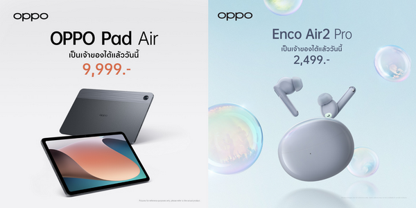 ออปโป้ ไทยแลนด์ เปิดตัวแท็บเล็ตรุ่นแรก “OPPO Pad Air” ชูสโลแกน “ดีไซน์บาง โฉบเฉี่ยว สนุกได้ไม่จำกัด” ในดีไซน์พื้นผิวแบบ Sunset dune สีเทา Fog Gray ด้วยกระบวนการ Reno Glow น้ำหนักเบาเพียง 440 กรัม พกพาสะดวก พร้อมหน้าจอถนอมสายตา 2K และลำโพงสเตอริโอ 4 ตัวระบบ Dolby Atmos เปิดตัวในราคา 9.999 บาท พร้อมกับ “OPPO Enco Air2 Pro” หูฟังไร้สายรุ่นล่าสุดให้คุณดำดิ่งสู่ห้วงมิติแห่งพลังเสียงด้วยไดรเวอร์ขนาดใหญ่ ระบบตัดเสียงรบกวนสุดล้ำ ในดีไซน์โดดเด่นทั้งสีเทาและสีขาวคลาสสิกและแบตเตอรี่ที่ใช้งานได้ยาวนาน เปิดตัวในราคา 2,499 บาท สัมผัสและเป็นเจ้าของผลิตภัณฑ์ IoT รุ่นล่าสุดจากออปโป้ได้แล้ววันนี้ ณ OPPO Brand Shop ทุกสาขา และตัวแทนจำหน่ายทั่วประเทศ