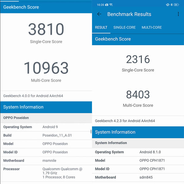 และมีผลทดสอบการประมวลผลแบบแกนเดี่ยว (Single-Core) ที่ 3,810 คะแนน และการประมวลผลแบบหลายแกน (Multi-Core) ที่ 10,963 คะแนน ซึ่งถือว่าสูงขึ้นพอสมควรเมื่อเทียบกับ OPPO Find X ที่ใช้งานชิปเซ็ต Snapdragon 845 ด้วยผลการทดสอบ 2,316 คะแนน และ 8,403 คะแนน ตามลำดับ