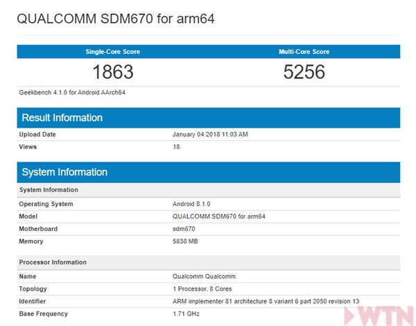 สำหรับชิป Snapdragon 670 นับว่าเป็นชิปเซ็ตอีกหนึ่งรุ่นที่น่าสนใจไม่ใช่น้อย เพราะตามข้อมูลระบุว่า เป็นชิปเซ็ตที่ผลิตด้วยสถาปัตยกรรมระดับ 10 นาโนเมตร FinFET เหมือนกับชิปเรือธงอย่าง Snapdragon 835 หรือชิป Exynos 8895 โดยมีจุดเด่นในด้านของการประหยัดพลังงาน และความเร็วแรงนั่นเอง โดย Snapdragon 670 นั้น จะเป็นชิปเซ็ตประมวลผลแบบ 8 แกน (Octa-Core Processor) ภายในแบ่งออกเป็นแกนประหยัดพลังงาน Cortex-A55 (Kyro 300) จำนวน 6 แกน และแกนประสิทธิภาพสูง Cortex-75 (Kyro 300 Gold) จำนวน 2 แกน ส่วนหน่วยประมวลผลกราฟิก (GPU) เลือกใช้ Adreno 615 ซึ่งผลคะแนนทดสอบการประมวลผลด้าน CPU จาก Geekbench ทำคะแนนทดสอบแบบ Single-Core ได้ถึง 1845 คะแนน ส่วน Multi-Core ได้ทั้งหมด 5215 คะแนนด้วยกัน ซึ่งถือว่าใกล้เคียงกับชิประดับเรือธงของค่าย Snapdragon ซีรีส์ 8xx ส่วนคะแนนประมวลผลกราฟิกก็มีข้อมูลว่าแรงพอๆ กับ Snapdragon 820 เลยทีเดียว