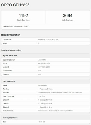 จากภาพหน้าจอที่กล่าวถึง พบสมาร์ตโฟน OPPO รุ่นใหม่หมายเลขรุ่น CPH2825 โผล่บน Geekbench และจากข้อมูลการรับรองที่เคยพบก่อนหน้านี้ ระบุว่าอุปกรณ์รุ่นนี้จะใช้ชื่อ OPPO Reno 15 เมื่อทำตลาด Global