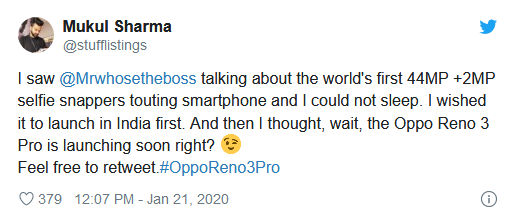 ข่าวลือนี้ถูกเผยแพร่บน Twitter โดย tipster ชาวอินเดีย Mukul Sharma ที่ได้รับข้อมูลต่อมาจาก YouTuber สายไอทีชื่อดัง Arun Maini ซึ่งอ้างว่า อาจจะมีการเปิดตัวสมาร์ทโฟนรุ่นใหม่ที่มีกล้องหน้าคู่ความละเอียด 44+2 ล้านพิกเซลในประเทศอินเดียเร็วๆ นี้ ซึ่งจะเป็นสมาร์ทโฟนที่มีกล้องหน้าความละเอียดสูงที่สุดในวงการ และว่ากันว่าสมาร์ทโฟนที่ว่านี้อาจจะเป็น OPPO Reno 3 Pro เวอร์ชันใหม่ที่มีสเปกบางส่วนต่างจากเวอร์ชันที่เปิดตัวในจีนไปเมื่อปลายปีที่แล้วที่มีกล้องหน้า 32 ล้านพิกเซลเพียงตัวเดียว อย่างไรก็ดี ยังไม่ทราบว่าสเปกอื่นๆ จะแตกต่างจากรุ่นที่เปิดตัวในจีนด้วยหรือไม่