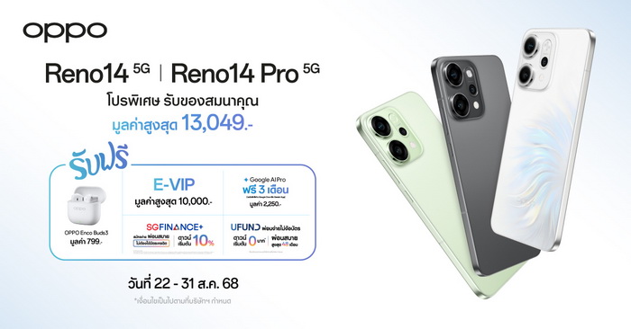 เมื่อซื้อ OPPO Reno14 5G และ OPPO Reno14 Pro 5G ระหว่างวันที่ 22 สิงหาคม – 31 สิงหาคม 2568 นี้ รับทันทีของสมนาคุณ หูฟังไร้สาย OPPO Enco Buds3 มูลค่า 799 บาท ที่ OPPO Brand Shop ที่ร่วมรายการ ห้ามพลาดโอกาสเป็นเจ้าของสมาร์ตโฟนสุดชิคพร้อมของแถมสุดคุ้ม!