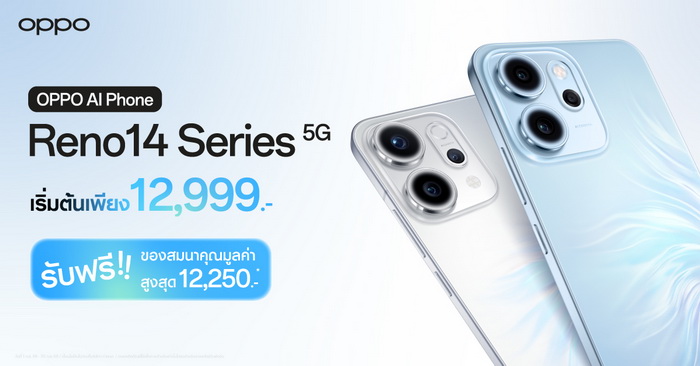 OPPO Reno14 Series 5G เปิดโปรแรง! ของแถมสูงสุด 12,250 บาท มาพร้อมกล้อง AI Portrait ซูม 120 เท่า