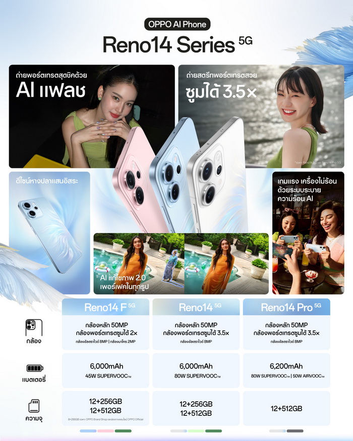 - OPPO Reno14F 5G ความจุ 12+512GB ราคา 14,999 บาท