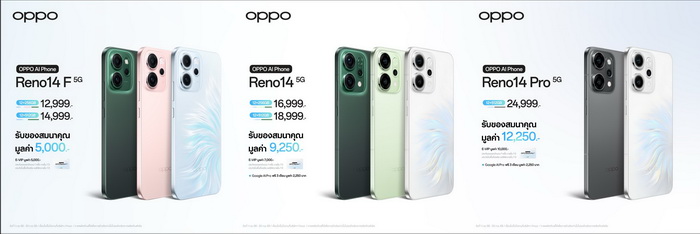 - สำหรับลูกค้าที่ซื้อ OPPO Reno14 5G จะได้รับของสมนาคุณมูลค่าสูงสุด 9,250 บาท E-VIP ประกันจอแตกจำนวน 1 ครั้ง ภายในระยะเวลา 1 ปีและประกันในพื้นที่เอเชีย-แปซิฟิก (นับจากวันที่ซื่อเครื่อง ผลบังคับใช้ 1 ปี) มูลค่า 7,000 บาท และรับสิทธิ์ Google AI Pro ฟรี 3 เดือน มูลค่า 2,250 บาท