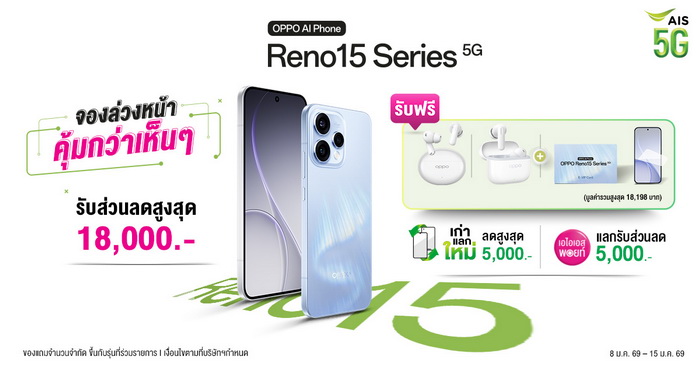 OPPO Reno15 Series 5G เปิดตัวในไทย จับมือ AIS ดัน AIS 5G+ NRCA พร้อมโปรลดสูงสุด 18,000 บาท เริ่ม 6,999 บาท
