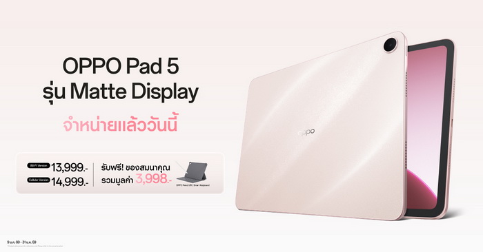 ลูกค้าที่ซื้อ OPPO Pad 5 Matte Display Edition 5G และ OPPO Pad 5 Matte Display Edition Wi-Fi จะได้รับของสมนาคุณพิเศษมูลค่า 3,998 บาท ดังนี้